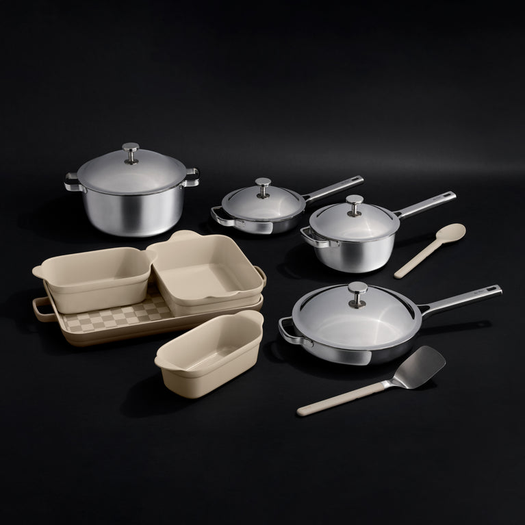 Our Titanium Pro cookware boasts the best of all worlds: timeless, high-shine stainless steel exterior, an ultra-conductive aluminum core, and a virtually indestructible titanium interior.